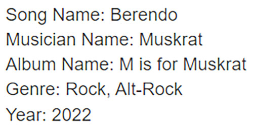 Indie Music Berendo by Muskrat Jessica080806 August 18, 2022 0 () Listen to the song Berendo by Muskrat on Naked Girls Radio. Rate this song! Click on a star to rate it! Submit Rating Average rating / 5. Vote count: No votes so far! Be the first to rate this song. Tags Music Genre indie rock music Share This Indie Track! 🔥 🔗 Copy Link 𝕏 Share on X 📘 Facebook 📌 Reddit https://ngrmusic.com/berendo-by-muskrat/ Post navigation Previous: NGR Season 27 Episode 9: New Music on this Beautiful August EveningNext: Galactic Trance by DJ Shadowmind – NGR Musician Directory More Stories Indie Music Shows / Channels Winter Chill Trance Drift Phonk DJ Mix 2026 | High-Energy Winter Beats by Jessica080806 Jessica080806 January 19, 2026 0 Indie Music Podcast NGR Season 31 Episode 3: Max Benson, Doug Feltz & Mike Bowen – LRSH Part 2 Jessica080806 January 16, 2026 3 Holiday Indie Music Podcast NGR Season 28 Episode 12: Special Christmas Show & Tons of Great Holiday Music! Jessica080806 December 18, 2025 8 Comments (0) Cancel replyYour email address will not be published. Required fields are marked *Comment * Name * Email * Website Δ