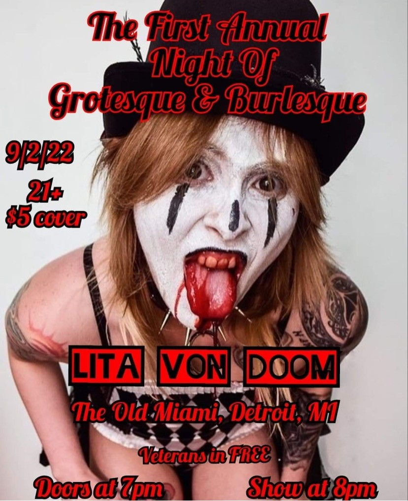 Hailing from the tiny city of Niles, Michigan, Lita Von Doom got her start performing in the exotic dance scene of Kalamazoo, Michigan. After dancing in the local club scene, she fell in love with the art of burlesque and competed in many showgirl competitions. She has been crowned Ms. Nude Blonde Us 2o17, Ms. Nude rock and roll 2018 (at the world-famous nudesapoppin ), among many other titles. While pursuing her lifelong dream of becoming a sideshow arts performer, Lita trained at the world-famous Coney Island USA in Brooklyn, NY.